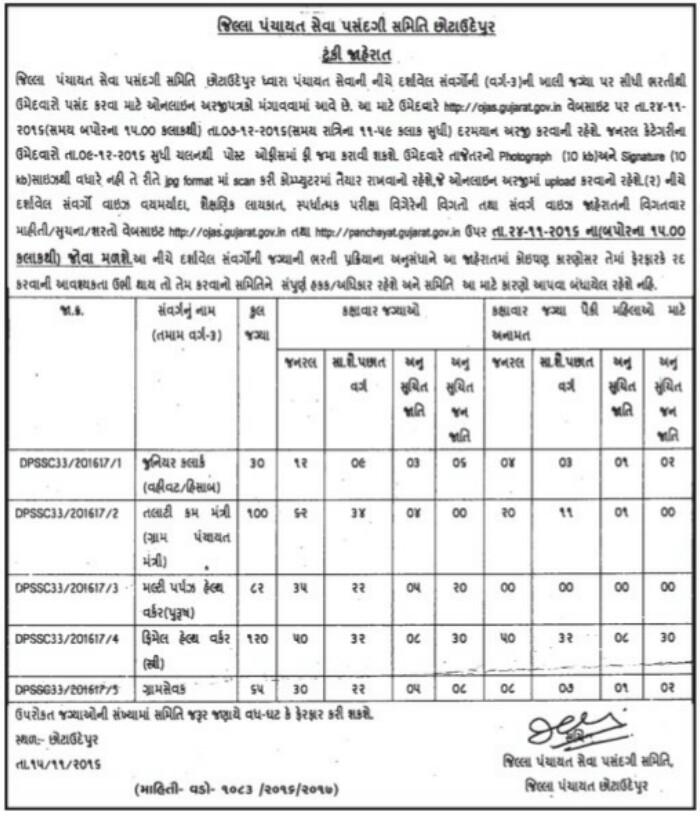 Top News:-Chhota-Udepur District Panchayat Talati Cum Junior Clarke,MPHW,FHW,Gram Sevak Bharati Related Important Press Not Declared.This Related All Details Available On ojasonline.in.jilla panchayat Tapi dvara niche darshveli jagyao par 24-11-2016 thi 7-12-2016 sudhi form bhari shakashe.