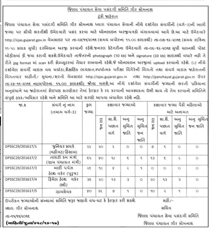 Top News:-Gir Somnath District Panchayat Talati Cum Junior Clarke,MPHW,FHW,Gram Sevak Bharati Related Important Press Not Declared.This Related All Details Available On ojasonline.in.jilla panchayat Gir Somnath dvara niche darshveli jagyao par 24-11-2016 thi 7-12-2016 sudhi form bhari shakashe.