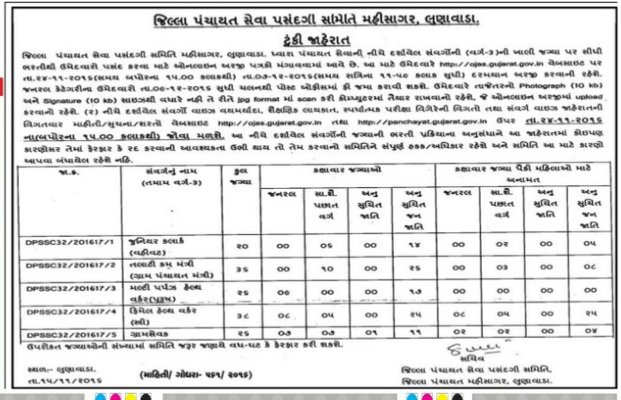 Top News:-Mahisagar District Panchayat Talati Cum Junior Clarke,MPHW,FHW,Gram Sevak Bharati Related Important Press Not Declared.This Related All Details Available On ojasonline.in.jilla panchayat Tapi dvara niche darshveli jagyao par 24-11-2016 thi 7-12-2016 sudhi form bhari shakashe.