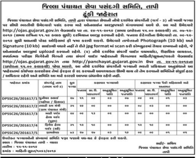 Top News:-Tapi District Panchayat Talati Cum Junior Clarke,MPHW,FHW,Gram Sevak Bharati Related Important Press Not Declared.This Related All Details Available On ojasonline.in.jilla panchayat Tapi dvara niche darshveli jagyao par 24-11-2016 thi 7-12-2016 sudhi form bhari shakashe.