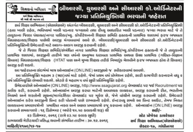 SSA Gujarat Recruitment 2016 for BRC/URC/CRC Co-ordinator Posts, Apply Online before 23,12.2016: The Sarva Shiksha Abhiyan Gujarat has released an Advertisement on the official website at www.ssagujarat.org for Various vacant posts of BRC/URC/CRC Co-ordinator Posts. The SSA Gujarat wants to fill up various vacancies through Merit basis appointment of eligible candidates for BRC/URC/CRC Co-ordinator posts in 2016. The candidates are eligible to apply online for SSA Gujarat Recruitment 2016 via official website portal at www.ssagujarat.org. The Sarva Shiksha Abhiyan will accept the Applications till 23th December 2016. The candidates must apply within given time period as the applications received after the last date will be Rejected.